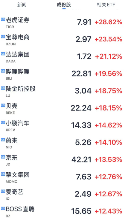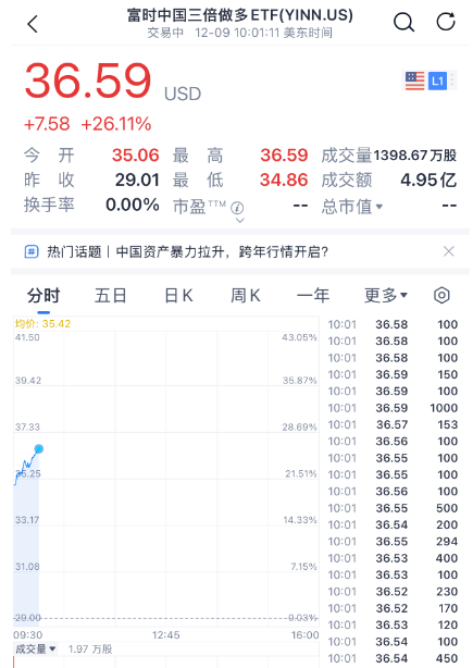12月9日晚间,美股开盘之后,中国资产直线飙涨,中概股指数涨超10%,富时中国三倍做多ETF暴涨超25%!