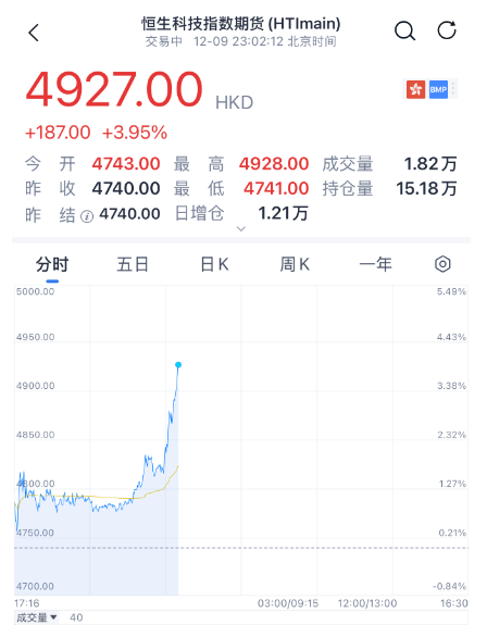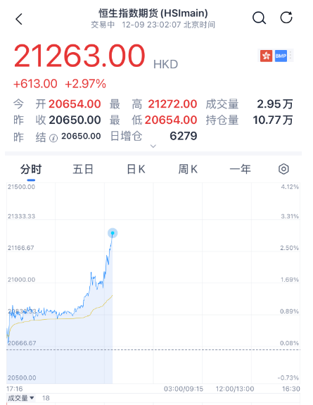 恒生指数、恒生科技指数在夜盘不断扩大涨幅,分别涨约3%、4%!