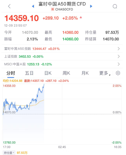 富时中国A50期货指数在周一下午收盘涨超4%的基础上,夜间涨2%!