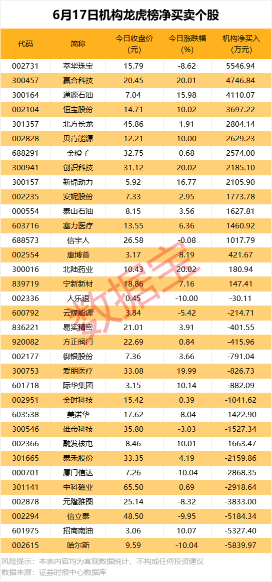 今日龙虎榜中,共13股获机构净买入超千万元,萃华珠宝获机构净买入5546.94万元,居首;其次是赢合科技、通源石油,均获净买入超4000万元。