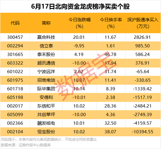 今日龙虎榜现身个股中,4股获北向资金净买入,净买入居首的是赢合科技,金额为2826.91万元;信立泰、泰禾股份、超讯通信获净买入金额均超300万元。